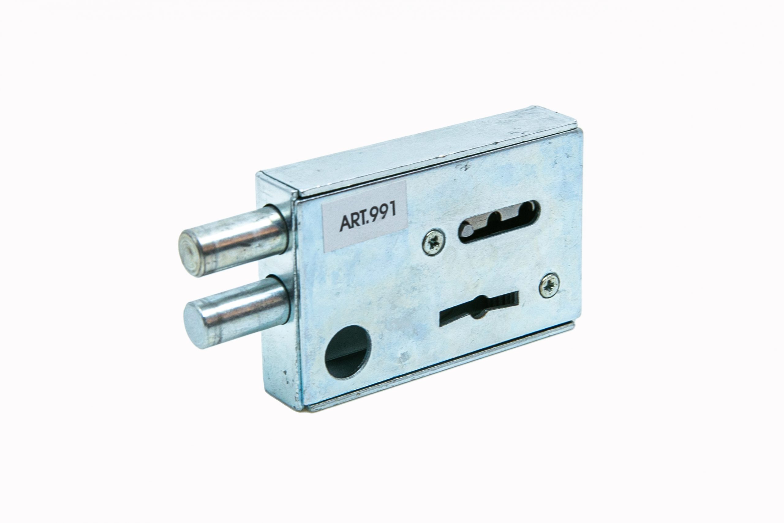 Cerradura para puertas de vidrio. Cuerpo de 70x45x16 mm.Traba horizontal de doble perno de 9mm de diámetro cada uno.Con 6 seguros
